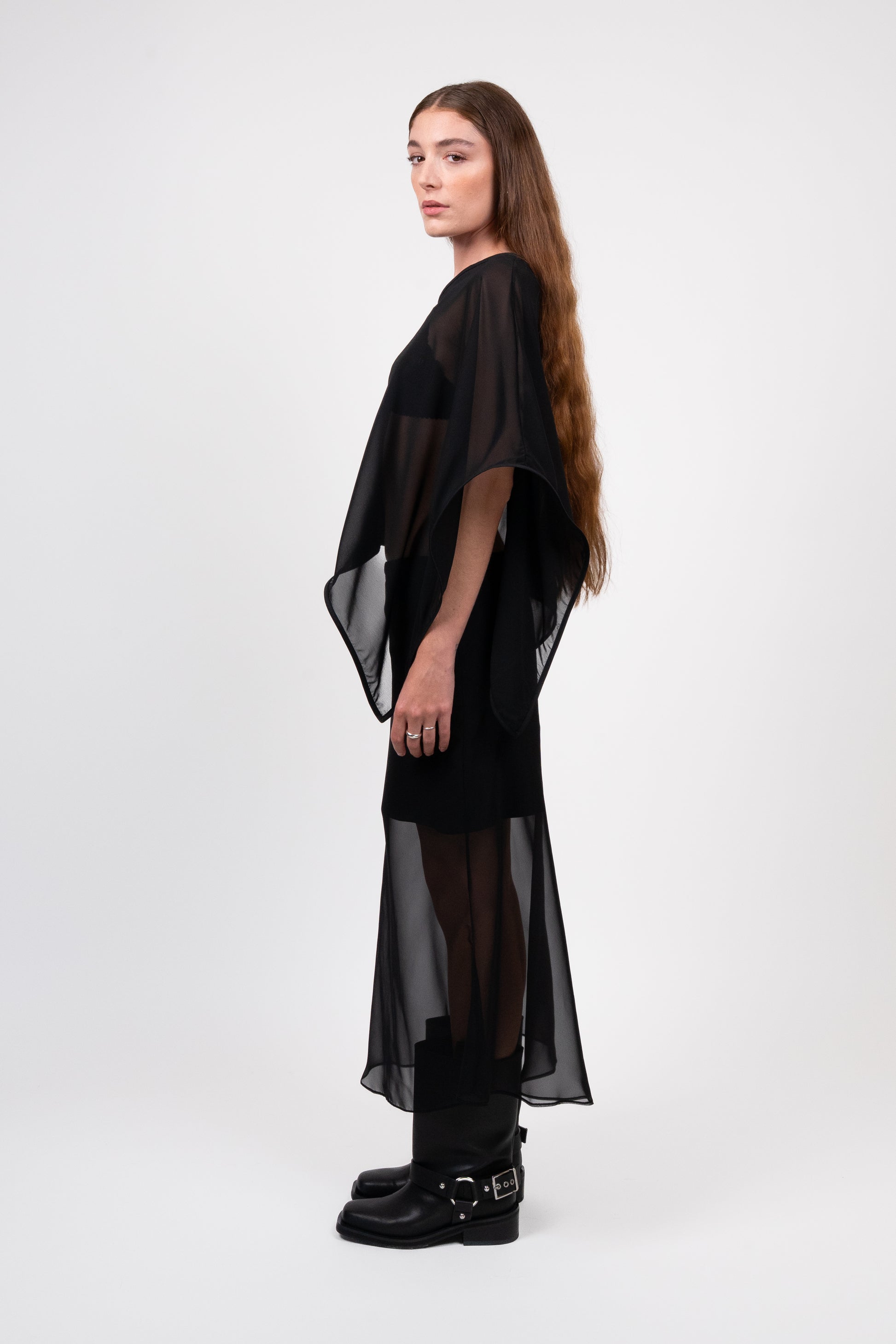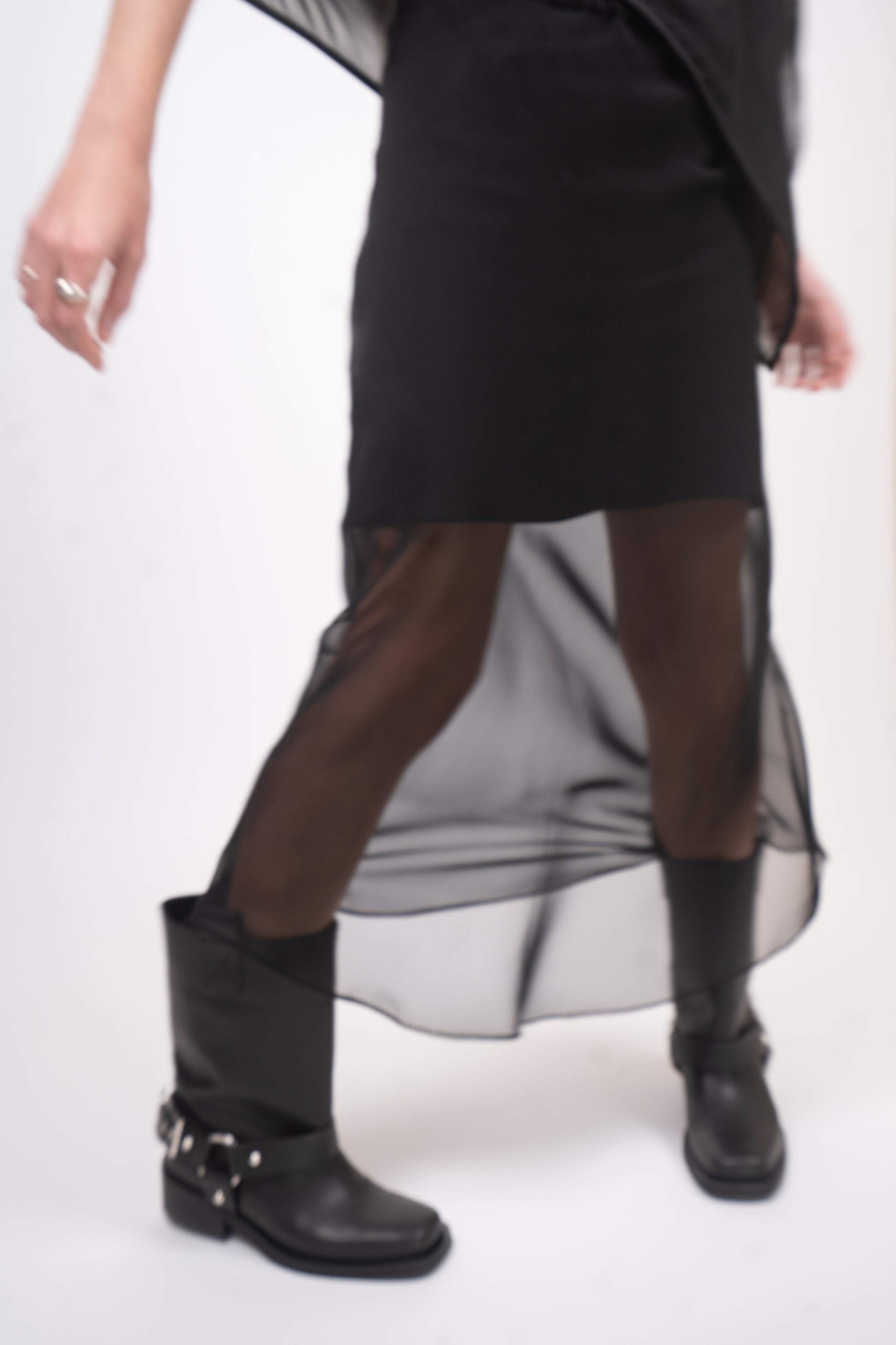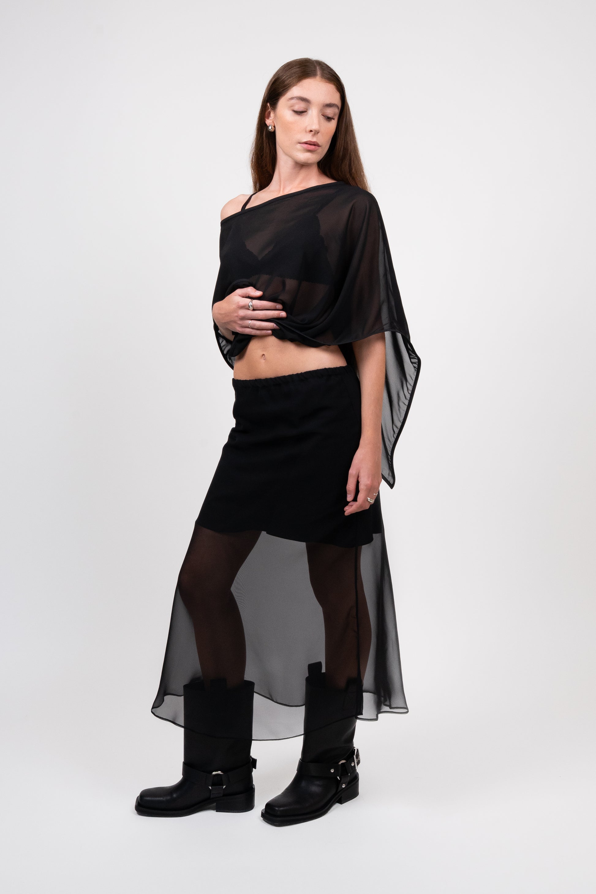 A double-layered, bias-cut skirt made from 100% cotton and reclaimed chiffon.