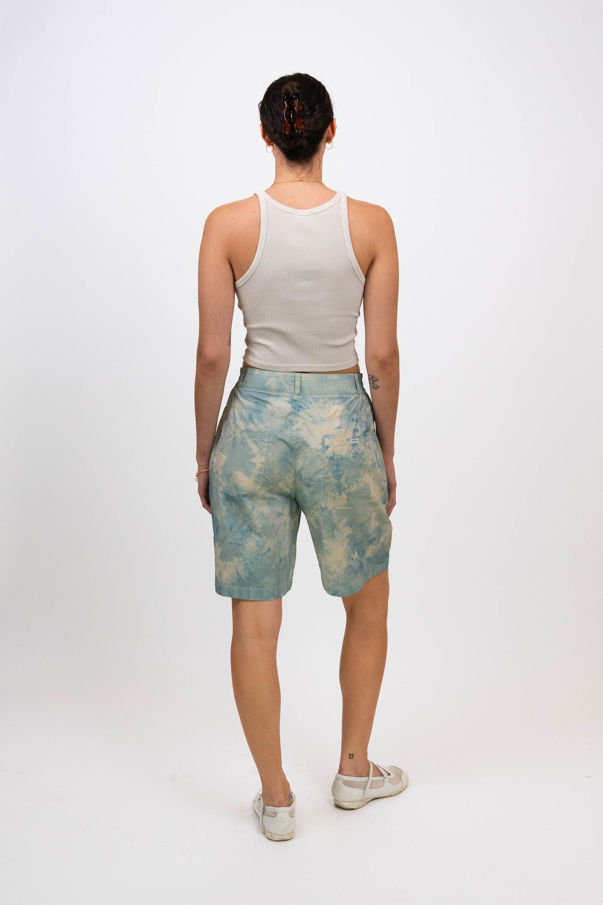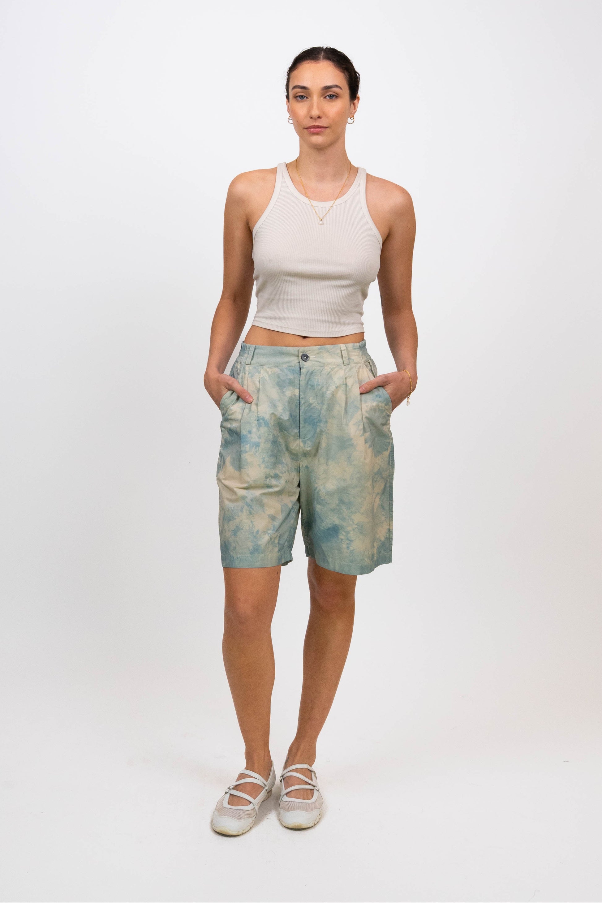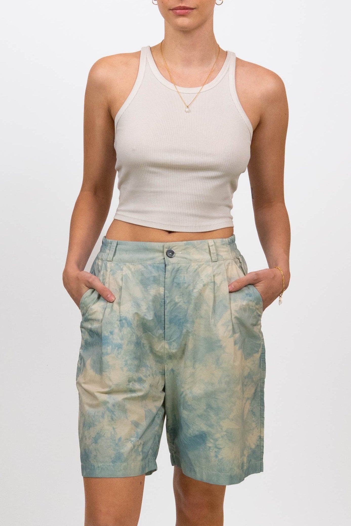 One of a kind pleated Terry shorts, sewn from reclaimed cotton and dyed with indigo. Featuring side waistband elastic and a vintage shell button.
