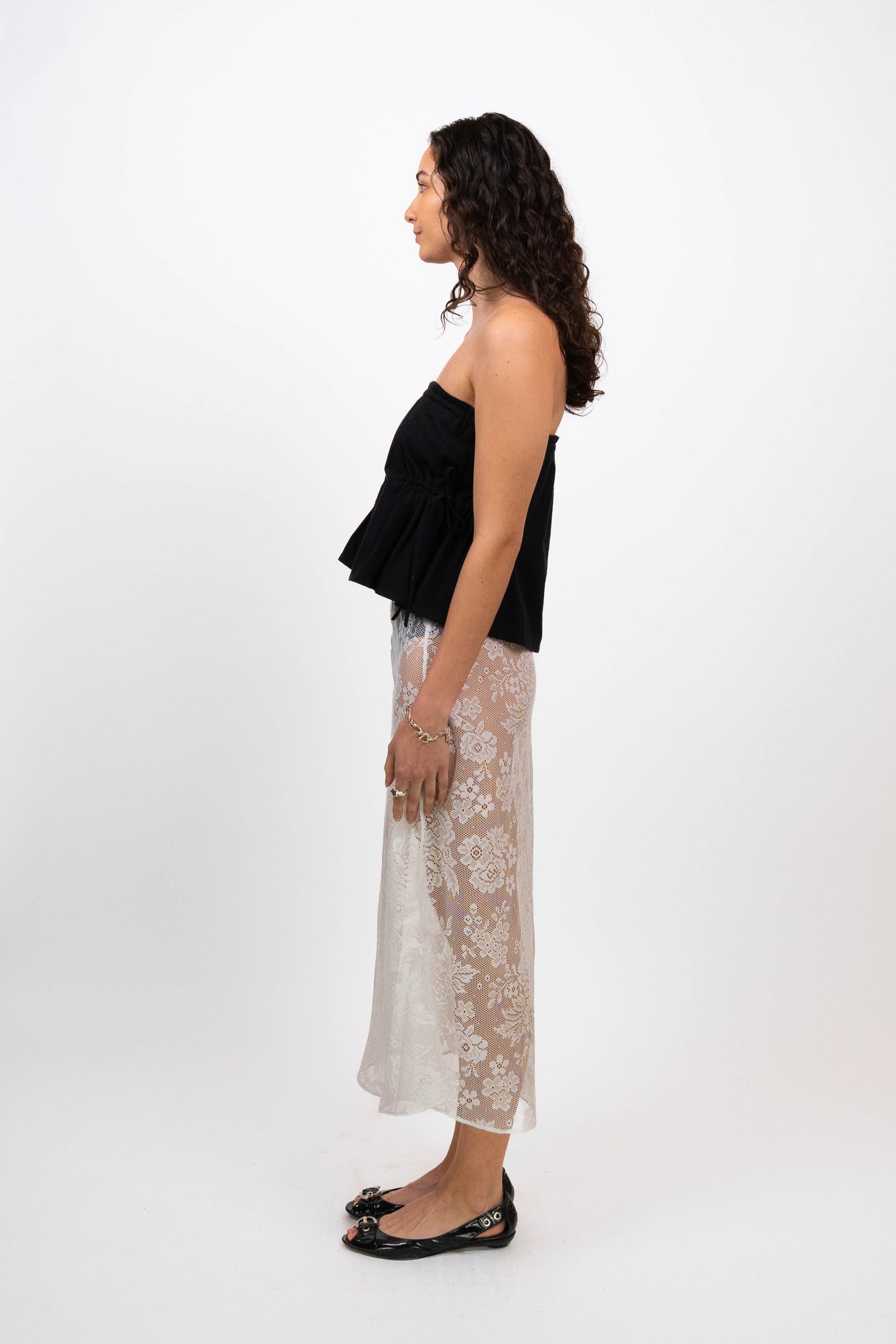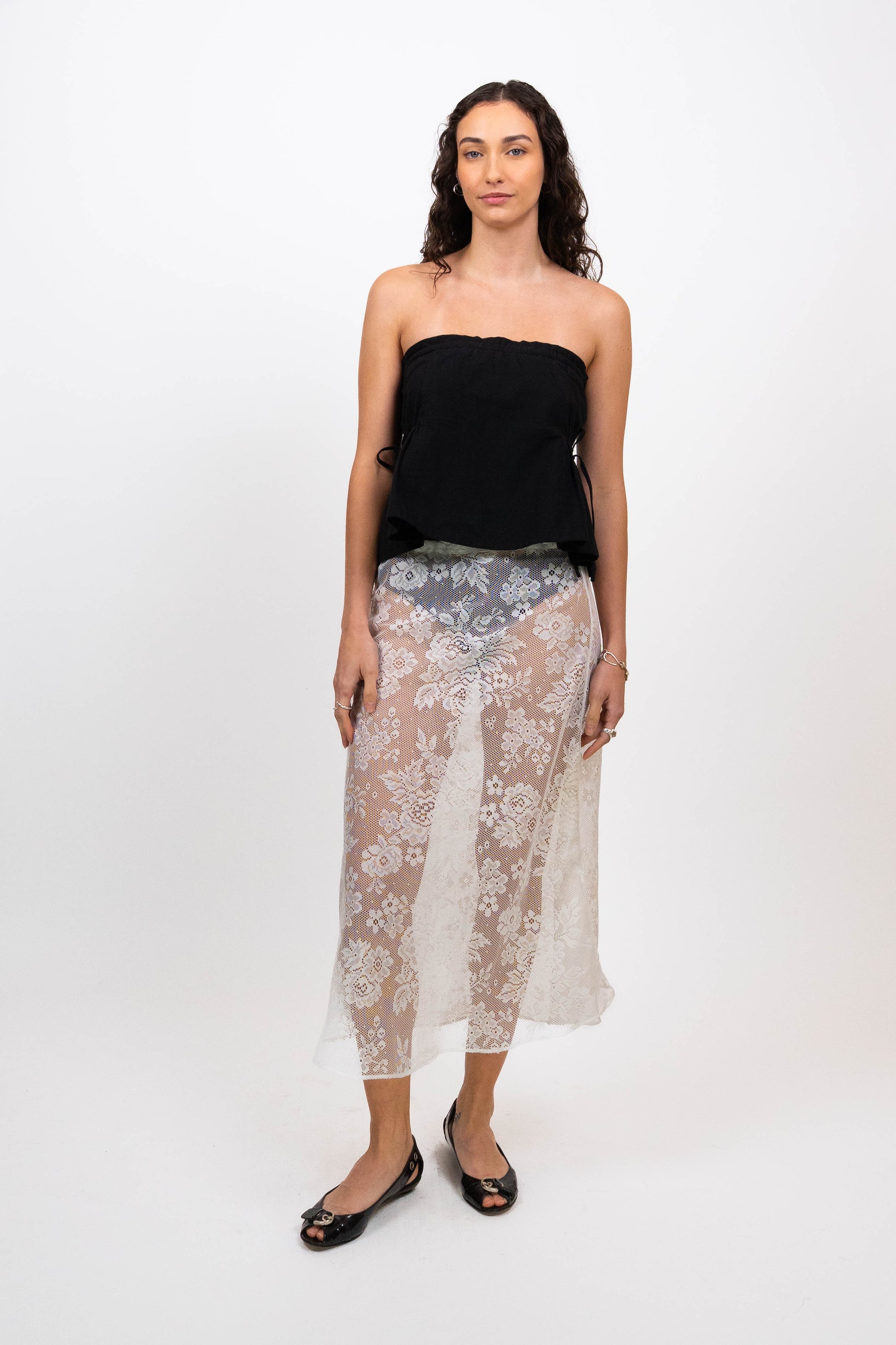 Lace midi length skirt sewn from reclaimed lace. Elasticized waistband, sheer and perfect for layering. One of a kind!