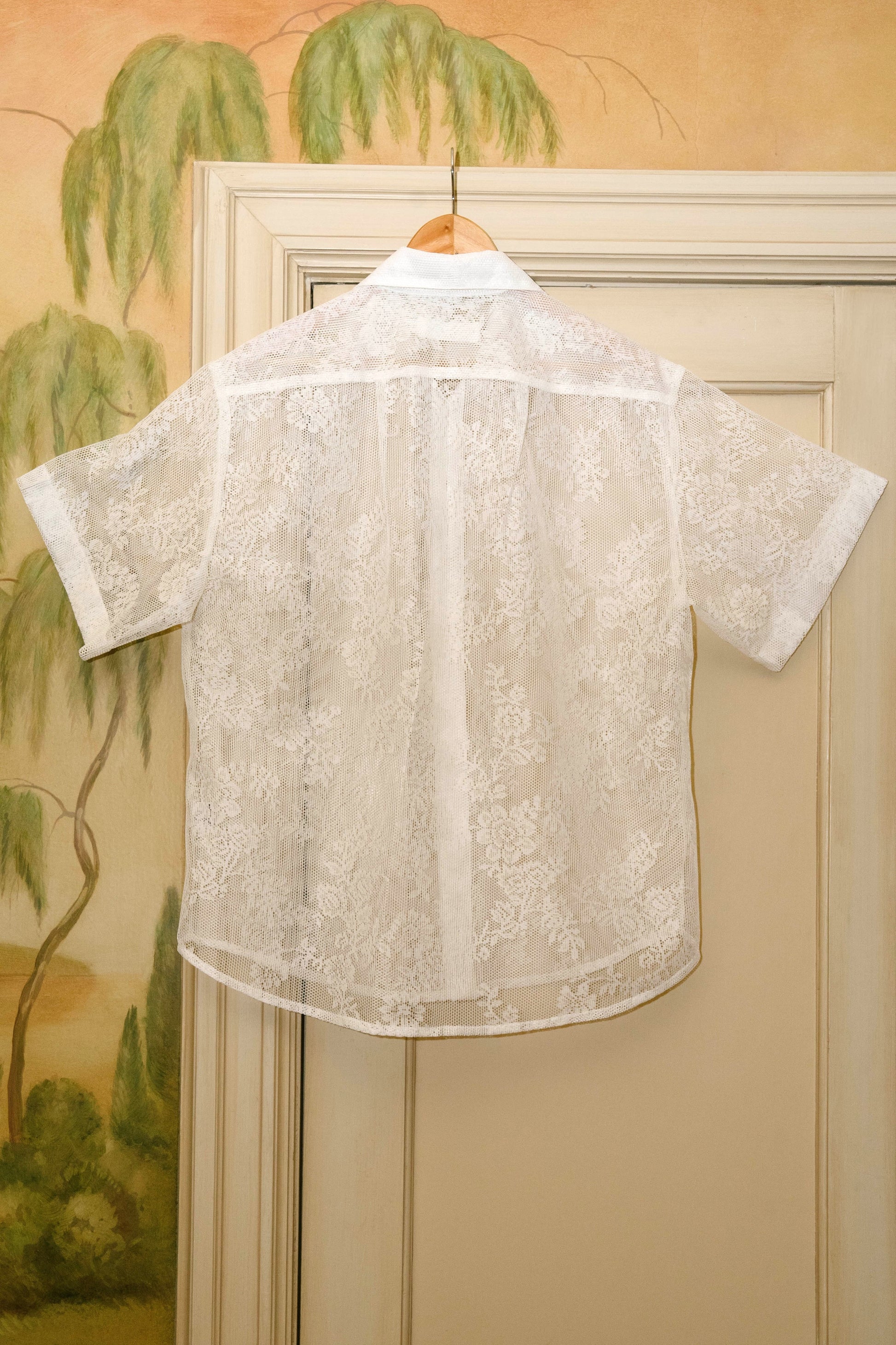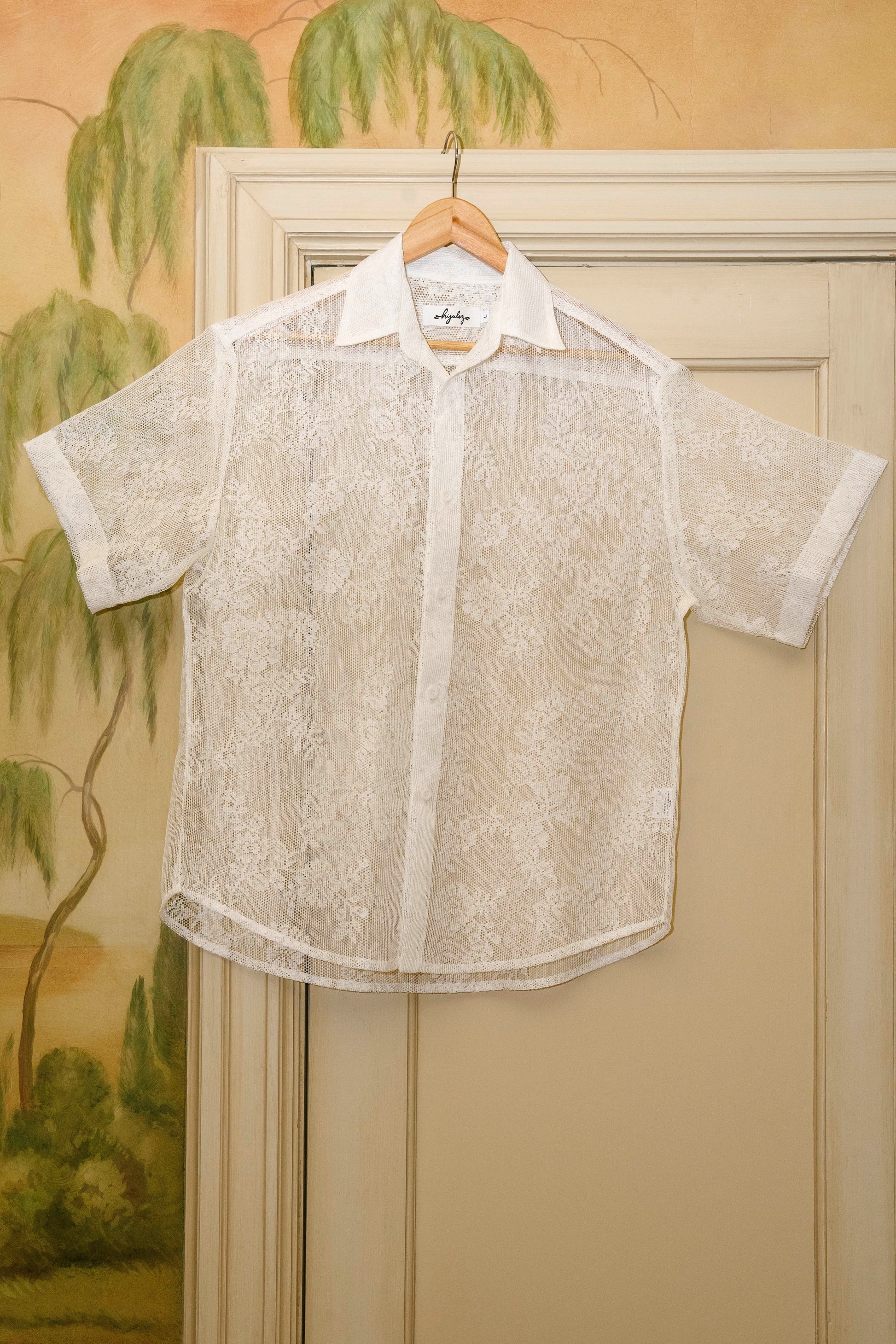 Our classic Trev button-down silhouette, sewn from 100% reclaimed lace and featuring our custom hijulez shell buttons.