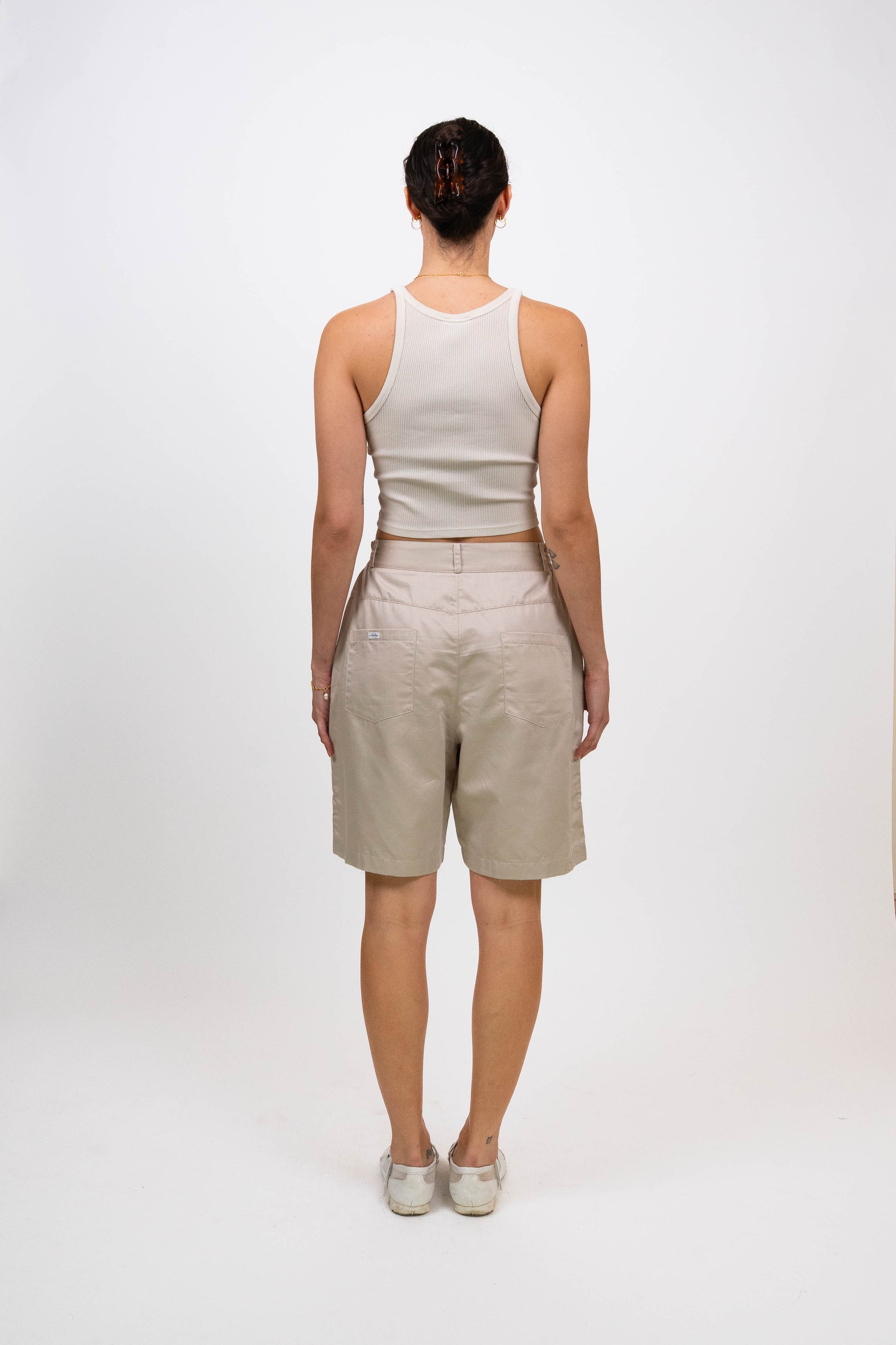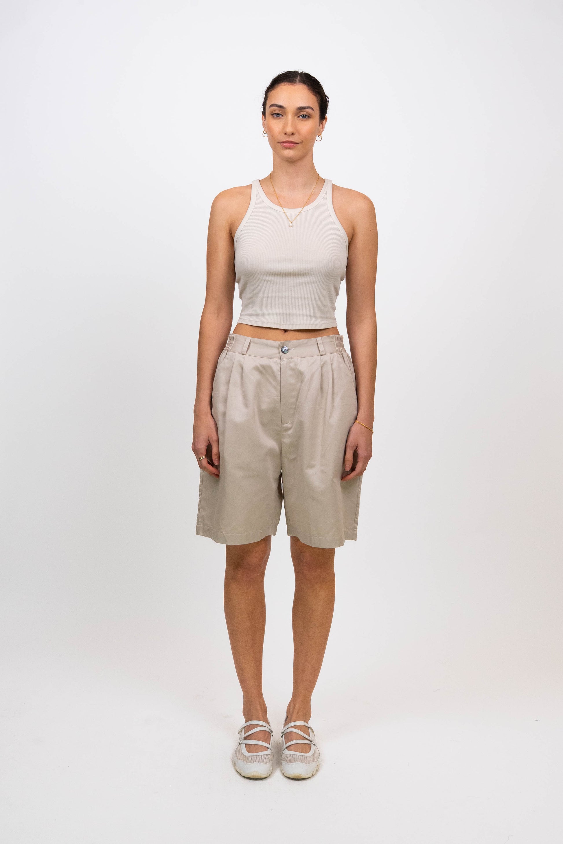 One of a kind pleated Terry shorts, sewn from reclaimed cotton. Featuring side waistband elastic and a vintage shell button.